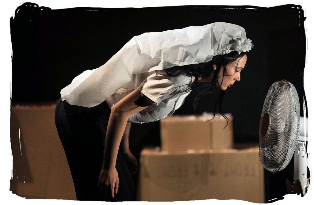 Il palcoscenico del Teatro Serra diventa un microcosmo inquietante: una semi oscurità avvolge lo spazio, dove la protagonista, immersa in un continuo movimento ossessivo, si trova a maneggiare scatole di cartone; oggetti del passato, ricordi inutili eppure imprescindibili, simbolo potente del fardello di una vita fatta di opportunità mancate e sogni soffocati. Ogni contenitore sembra rappresentare un frammento della sua esistenza, un piccolo pezzo di vita che, purtroppo, non può essere dimenticato né gettato via. Dal punto di vista scenografico la visione di Violetta Di Costanzo è notevole. Il palcoscenico si configura come un vero e proprio magazzino: un deposito di scatole che fanno pensare a qualcosa di chiuso, di sigillato e si fanno metafora della prigione emotiva della protagonista. Gli oggetti scenici, tutti realizzati in cartone, sono simboli di un mondo fragile, forse da proteggere, ma anche di una realtà che Minnie non riesce ad affrontare, come un universo tutto imballato che non può scartare. Questa barriera che si presenta sul palco, per quanto imponente, rivela chiaramente la sua vulnerabilità. Il cartone è un materiale che non può sostenere un grosso peso, proprio come la fragile psiche di Minnie. È interessante, inoltre, mettere in relazione questo materiale con il caldo di cui la protagonista si lamenta, tanto torrido che potrebbe quasi far prendere fuoco a questi contenitori impilati e disposti a formare un labirinto. Ogni scatola, ogni angolo di scena contribuisce a costruire un ambiente claustrofobico e privo di via d’uscita, che riflette la condizione interiore della protagonista. Minnie si ritrova rinchiusa in questo spazio che si fa metafisico e capisce che, di questi contenitori, lei potrebbe essere il contenuto. La luce si dissolve e proprio in uno di essi Minnie viene riposta.