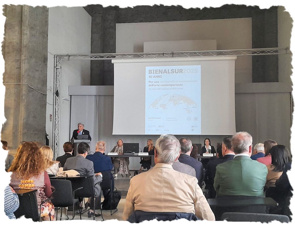La curatrice Diana Wechsler, vice-rettrice dell’Universidad Nacional de Tres de Febrero (UNTREF) di Buenos Aires, ha presentato il progetto BIENALSUR, che quest’anno celebra i 10 anni di attività. La biennale, organizzata da UNTREF e dalla Fondazione Foro del Sur, coinvolge 76 città, 130 sedi e oltre 400 artisti nel mondo, configurandosi come una cartografia culturale transnazionale e in costante evoluzione.