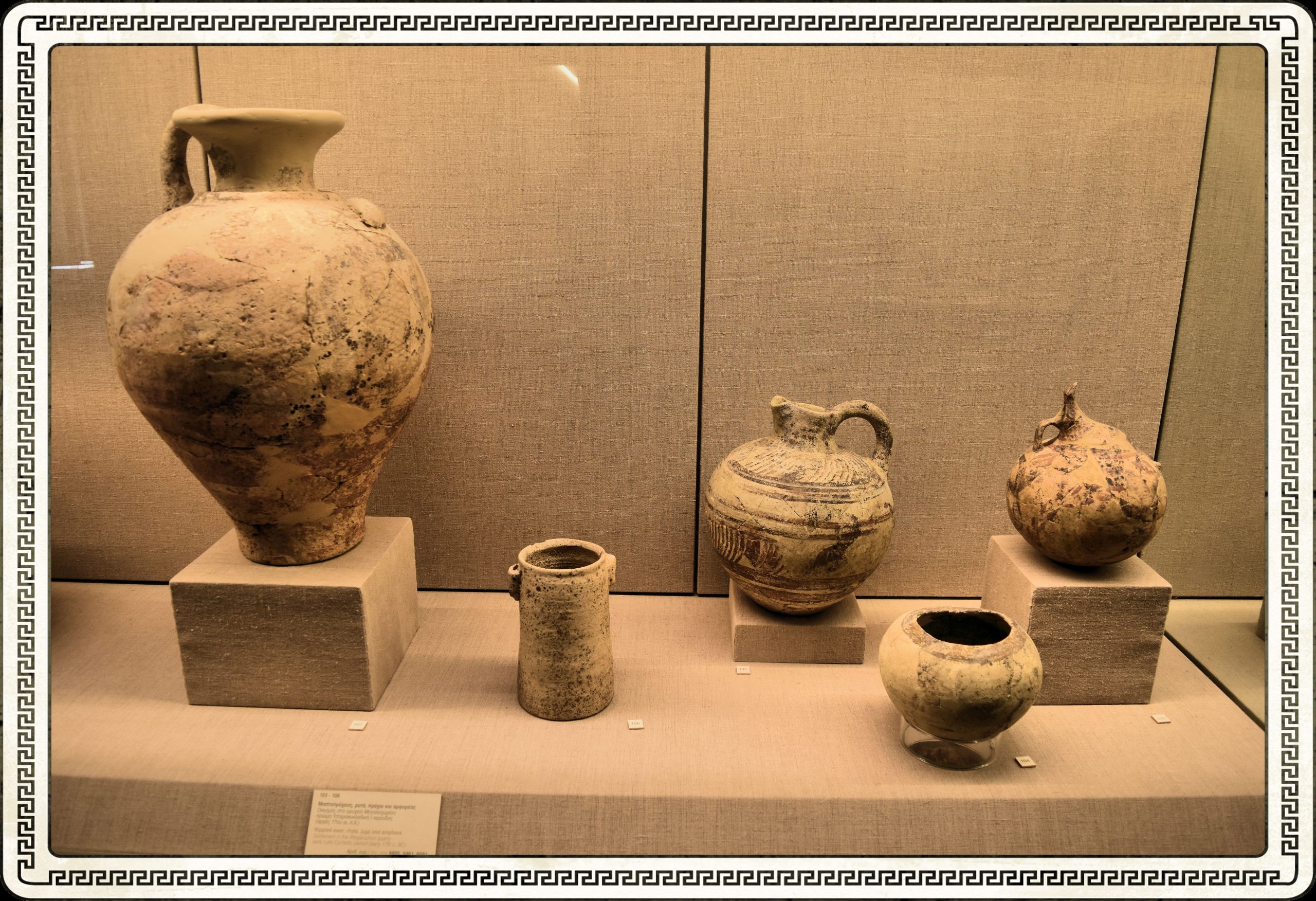 Brocca con protomi, rhyta, giare ed anfora – Insediamento nella cava di Megalochori – Inizio del tardo periodo cicladico (inizi del 17esimo secolo) – Museo preistorico di Thera, Santorini –…