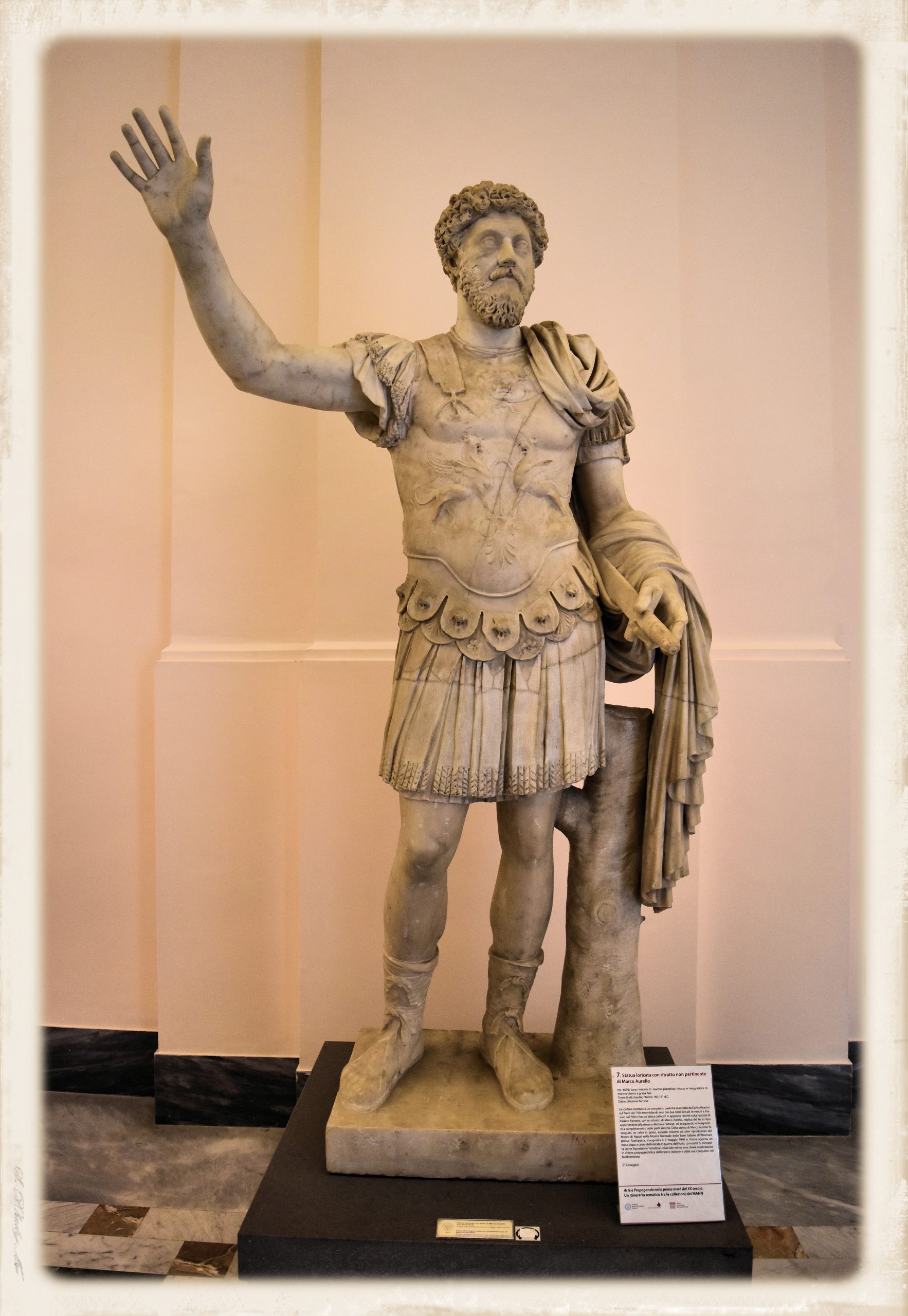 Statua loricata con ritratto non pertinente di Marco Aurelio – Torso loricato in marmo pentelico, ritratto e integrazioni in marmo bianco a grana fine – Torso di età claudia; ritratto:…