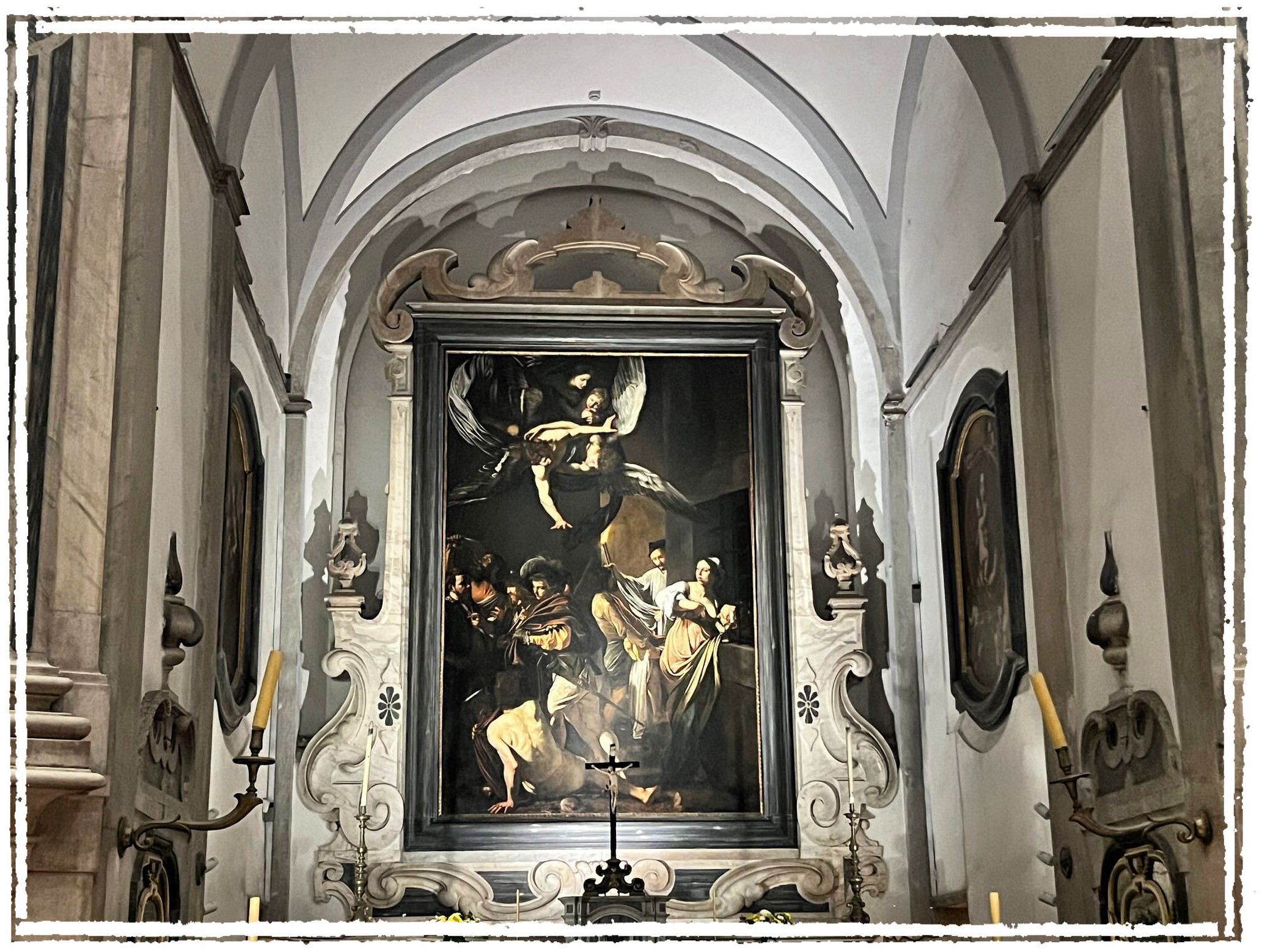 Cuore del Pio Monte è senz’altro la cappella, progettata anch’essa da Picchiatti, dedicata alla Madonna della Misericordia. Di impianto classico, a pianta ottagonale, questo delizioso luogo, impreziosito da raffinati elementi decorativi di gusto barocco, come il pavimento in cotto ad intarsi di marmi policromi, i paliotti, le acquasantiere e le grate in legno dorato dei coretti – dove anticamente i musici accompagnavano le celebrazioni liturgiche – fu concepito ribaltando la consuetudine per cui l’ornamento segue la costruzione, in funzione delle opere pittoriche che avrebbe ospitato. Infatti, la chiesa sorse intorno alla celebre opera del Caravaggio, Le sette Opere della Misericordia, che i sette fondatori dell’istituto commissionarono all’artista per raccontarne lo scopo: aiutare i bisognosi di Napoli. Merisi giunse in città da Roma sotto l’egida protettiva dei Carafa Colonna, in fuga dai rovesci della fortuna e dai rigori della giustizia romana. I committenti del dipinto compresero bene di essere di fronte ad un capolavoro assoluto, stabilendo, pertanto, che mai avrebbe potuto essere copiato e venduto.