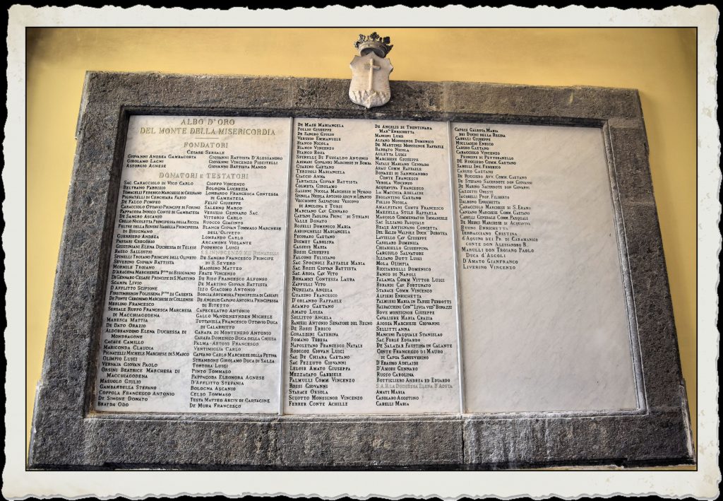 Lapide in marmo con elenco dei nomi dei fondatori, dei donatori e dei testatori del Pio Monte – Foto: Giorgio Manusakis