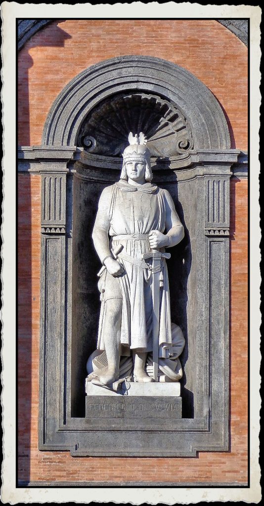 Napoli, Palazzo Reale, statua di Federico II di Svevia – Autore foto: Effems – Licenza: CC BY-SA 4.0, via Wikimedia Commons
