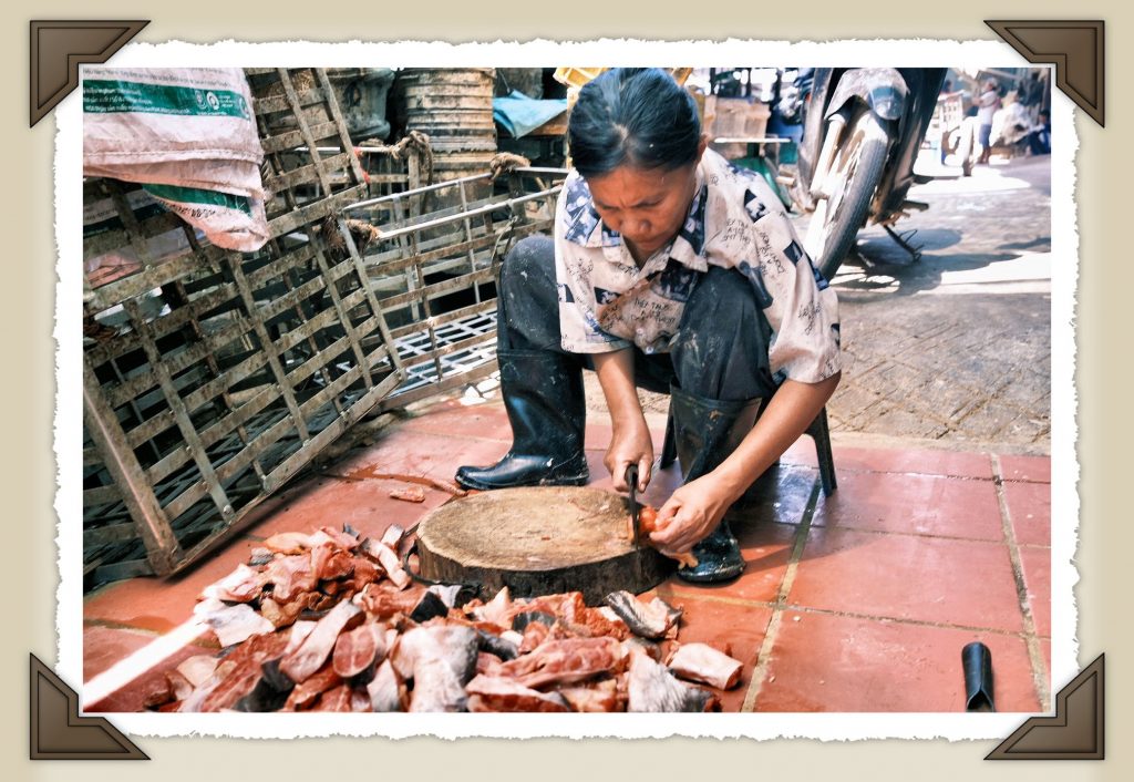 Al mercato arrivano le donne per prime. Portano cesti di vimini, sacchetti di plastica riutilizzati fino allo sfinimento, soldi contati con la precisione di chi sa bene quanto vale ogni riel. Camminano tra le bancarelle con quella sicurezza tranquilla di chi conosce ogni venditore per nome, ogni prezzo a memoria. Non c’è fretta, ma non c’è nemmeno tempo da perdere. Il pesce arriva fresco dal fiume e dalle peschiere vicine e la giornata di lavoro inizia con la luce.