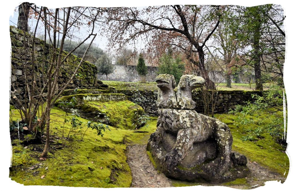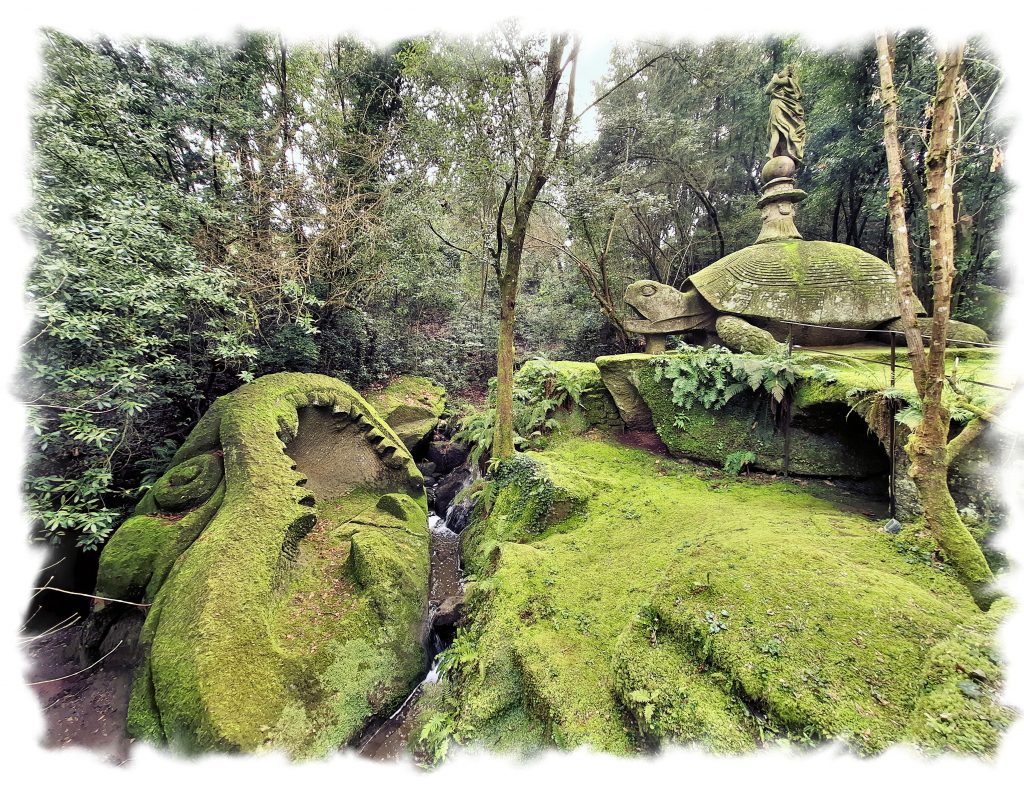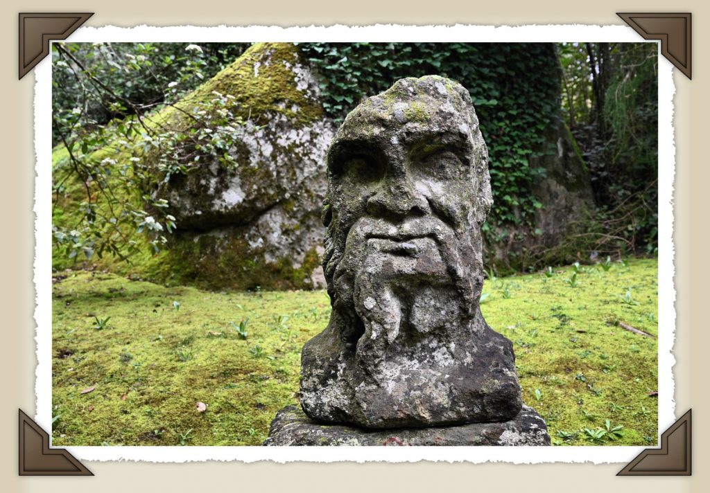 In questo mondo grottesco e immaginario le rocce di peperino e basalto, di antica origine vulcanica, vengono intagliate e scolpite per dar vita a edifici surreali e statue mostruose che sorprendono e disorientano continuamente il visitatore. Lungo il percorso, che si addentra in una zona ricca di vegetazione, spuntano all’improvviso sculture di sirene, mostri marini, tartarughe giganti, bocche enormi, satiri, guerrieri in lotta o torturati, sfingi, draghi, grandi maschere: figure mitologiche a cui ancora oggi i ricercatori non sono riusciti ad attribuire un significato definitivo, lasciando le allegorie del parco avvolte in un alone di mistero.