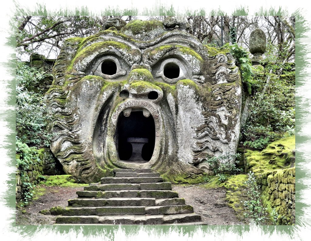 Con la testa che ancora gira, con i punti di riferimento messi a dura prova, si arriva alla scultura che sicuramente rappresenta il simbolo del parco: l’Orcus, o Orco, uno dei nomi di Ade, re degli inferi. In cima a una scalinata un grande mascherone inciso nella pietra fissa il visitatore che si avvicina. Ha la bocca spalancata nell’atto dell’urlo e gli occhi profondi e inquisitori, che sembrano cambiare espressione con il mutare delle ore e della luce del giorno. Sulle sue labbra si legge il messaggio di Vicino rivolto a chi accede: “Ogni pensiero vola”, con il duplice significato di invito o avvertimento. All’interno si apre una stanza scavata nel tufo, dove sono stati realizzati alcune panche e un tavolo che ricorda la forma di altare.