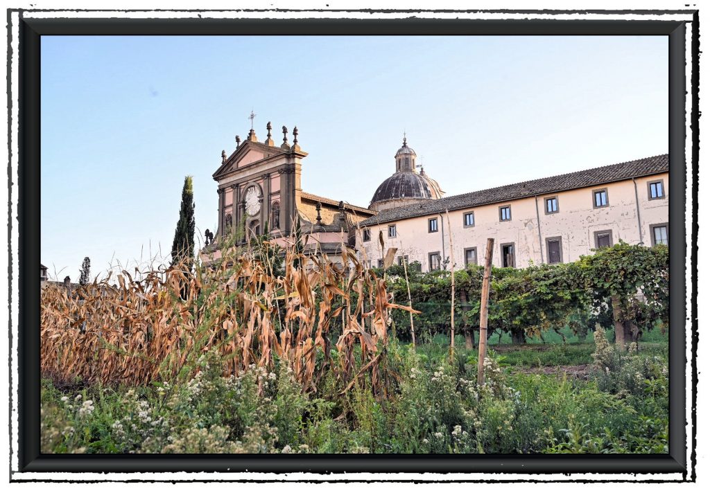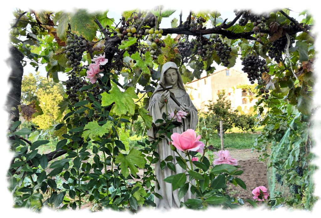Passeggiare, appunto, tra “zappe, stivali e rastrelli…” e intanto osservare i filari d’uva, le piante di pomodoro, le zucche in maturazione, gli alberi da frutto; continuare a raccontare il libro ed ammirare il lavoro costante svolto da più di duecento anni dai fedeli del convento è stata un’esperienza totalmente immersiva. Sotto l’ombra del pergolato è sistemata una panchina, la statua di una Madonnina e una pianta di rose: un invito a fermarsi per riflettere e contemplare la bellezza del creato anche durante il lavoro agricolo.