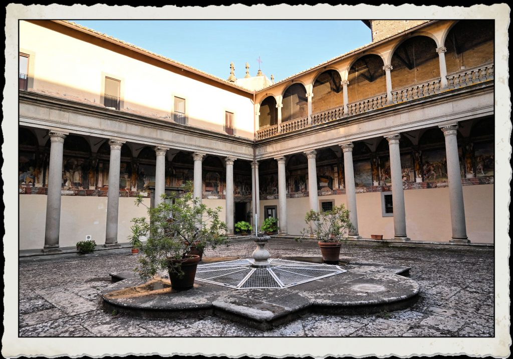 Il chiostro della SS. Trinità è uno dei chiostri rinascimentali più belli della provincia, ma poco visitato, perché decentrato rispetto alla zona più frequentata di San Pellegrino, ed anche poco conosciuto dai viterbesi stessi. Il suo accesso consiste in un portone al fianco della facciata della chiesa della SS. Trinità che, purtroppo, spesso è chiuso. Si tratta di un complesso monumentale di notevole bellezza: al centro è posizionata una fontana e tutto intorno vi è un porticato di 36 colonne in peperino, che proteggono gli affreschi della vita di S. Agostino, estesi intorno al cortile. Nel chiostro regna il silenzio, interrotto solo dallo zampillio dell’acqua. Ma il convento conserva anche un altro gioiello, svelato ai partecipanti del festival durante la presentazione del libro Zappe, stivali e rastelli della scrittrice Barbara Bernardini e della illustratrice Viola Niccolai, pubblicato dalla casa editrice Topipittori.
