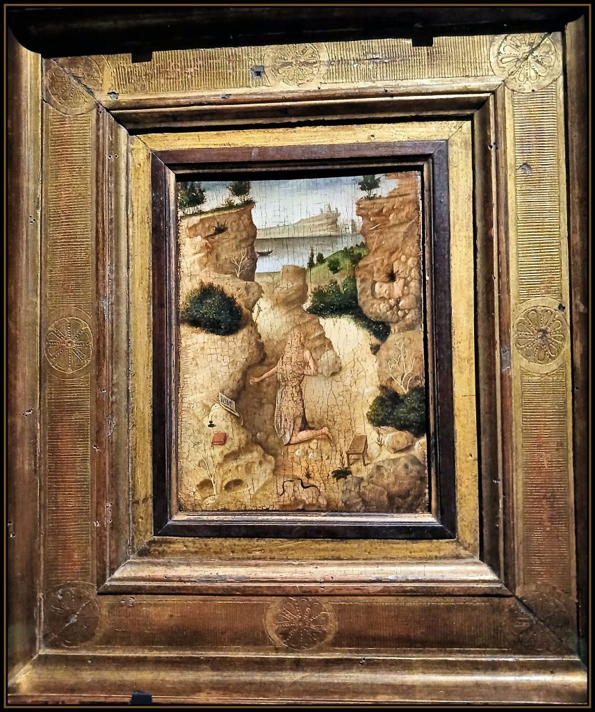 Sul lato posteriore della tavola l’artista realizzò un secondo dipinto. San Girolamo Penitente, in ginocchio davanti a un libro aperto e un calamaio in ossequio alla sua traduzione della Bibbia in latino, è sorpreso in un paesaggio naturale di rocce, alberi e uno specchio d’acqua sullo sfondo.