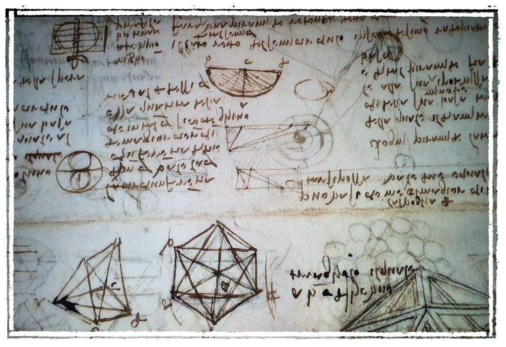 Una capacità di indagine prospettica reale e straordinariamente descrittiva; gli studi sulla geometria restituiscono i rapporti culturali di scambio con i maggiori scienziati a lui contemporanei, come Luca Paciolli e le sue ricerche sulla prospettiva. La scrittura a “specchio”, che Leonardo utilizzava nei suoi codici, non è altro che tracciare lettere e parole da destra verso sinistra, con caratteri invertiti, rendendole leggibili solo tramite uno specchio. Questa tecnica è stata usata in gran parte dei suoi codici, una abitudine naturale, per lui che era mancino; sebbene potesse scrivere anche con la destra, preferì sempre la grafia speculare che, con il tempo, divenne veloce e funzionale, unendo spesso una grafia corsiva molto elegante e armoniosa nei caratteri. In realtà scrivere al contrario evitava di far spandere l’inchiostro migliorando, in tal modo, la fruibilità dei suoi testi.