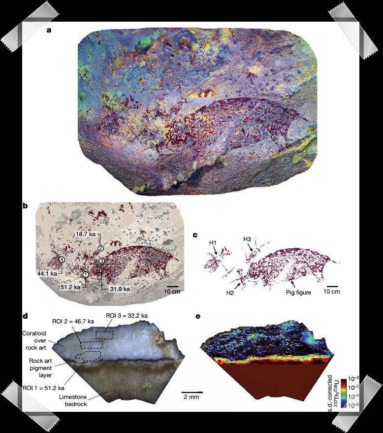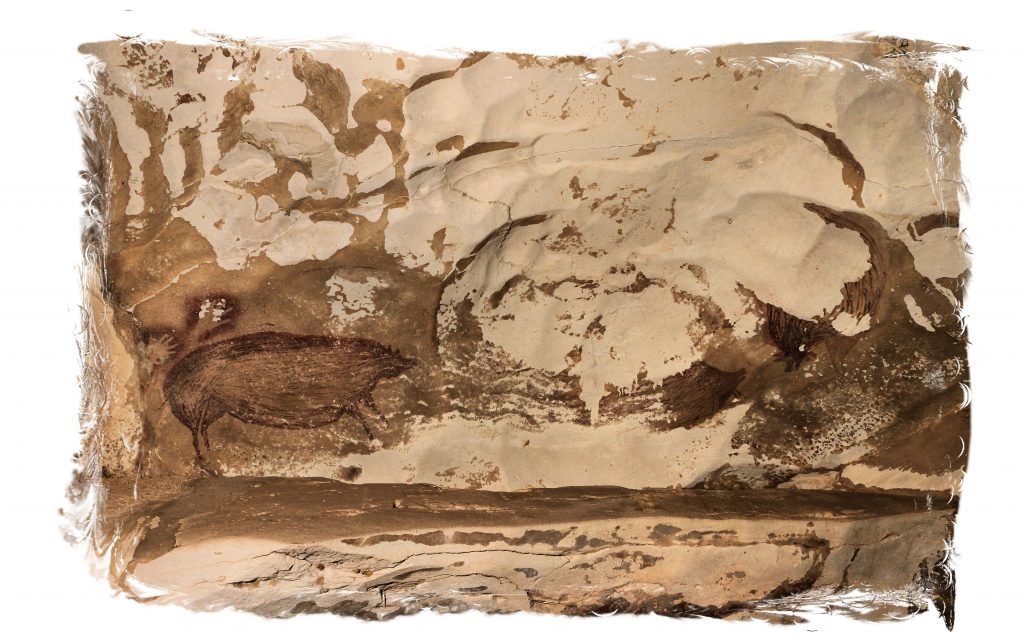 Un team di scienziati, guidato da ricercatori della Griffith University australiana, dell’Agenzia nazionale indonesiana per la ricerca e l’innovazione (BRIN) e della Southern Cross University, ha scoperto e datato una pittura rupestre sull’isola indonesiana di Sulawesi dipinta almeno 51.200 anni fa, pubblicando nel 2024, sulla rivista Nature, i risultati degli studi effettuati. La complessa rappresentazione figurativa, realizzata con pigmento rosso ocra, tratteggia figure umane che interagiscono con un grosso cinghiale selvatico. Secondo i ricercatori, l’opera dimostrerebbe “che le rappresentazioni figurative di figure antropomorfe e animali hanno un’origine più profonda nella storia della creazione di immagini da parte dell’uomo moderno (Homo sapiens) di quanto si pensasse finora, così come la loro rappresentazione in scene composte.” La composizione dispone i personaggi non come figure isolate, ma inserite in una scena che permette a chi guarda di desumere un racconto, che probabilmente era legato a miti o rituali piuttosto che a una semplice battuta di caccia.