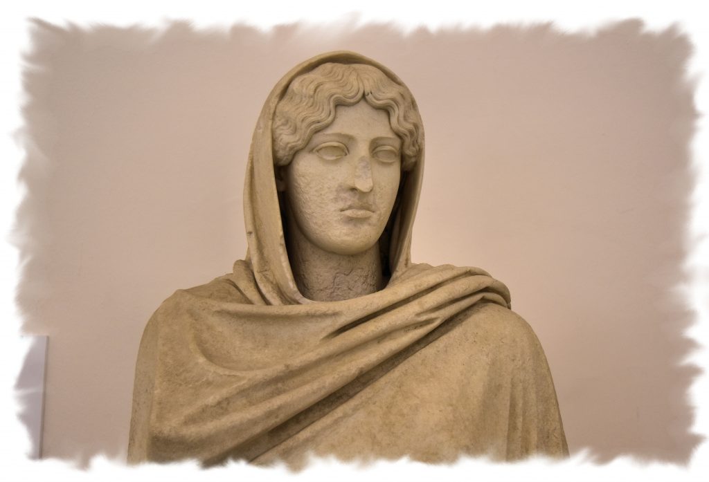 Presso le Terme di Baia, riconosciute come il Palatium imperiale noto dalle fonti letterarie, nel settembre 1952 fu portata alla luce la statua di donna avvolta da pesante mantello. Posa e abbigliamento permettono di riconoscere l’opera come una replica della Afrodite Sosandra dello scultore greco Calamide, attivo tra il 480 e il 440 a.C. L’originale bronzeo dell’Afrodite Sosandra, dal greco “che salva gli uomini”, è descritto da Luciano di Samosata (Imagines, IV. 6) e da Pausania (Periegesi, I. 23.2): dalle fonti si deduce che la statua era collocata all’ingresso dell’Acropoli di Atene. La statua rinvenuta a Baia era in fase di completamento da parte di una bottega locale che lavorava per il Palatium imperiale (fonte: didascalia mostra Oltre il visibile – I Campi Flegrei – MANN, 27 luglio – 10 novembre 2016)