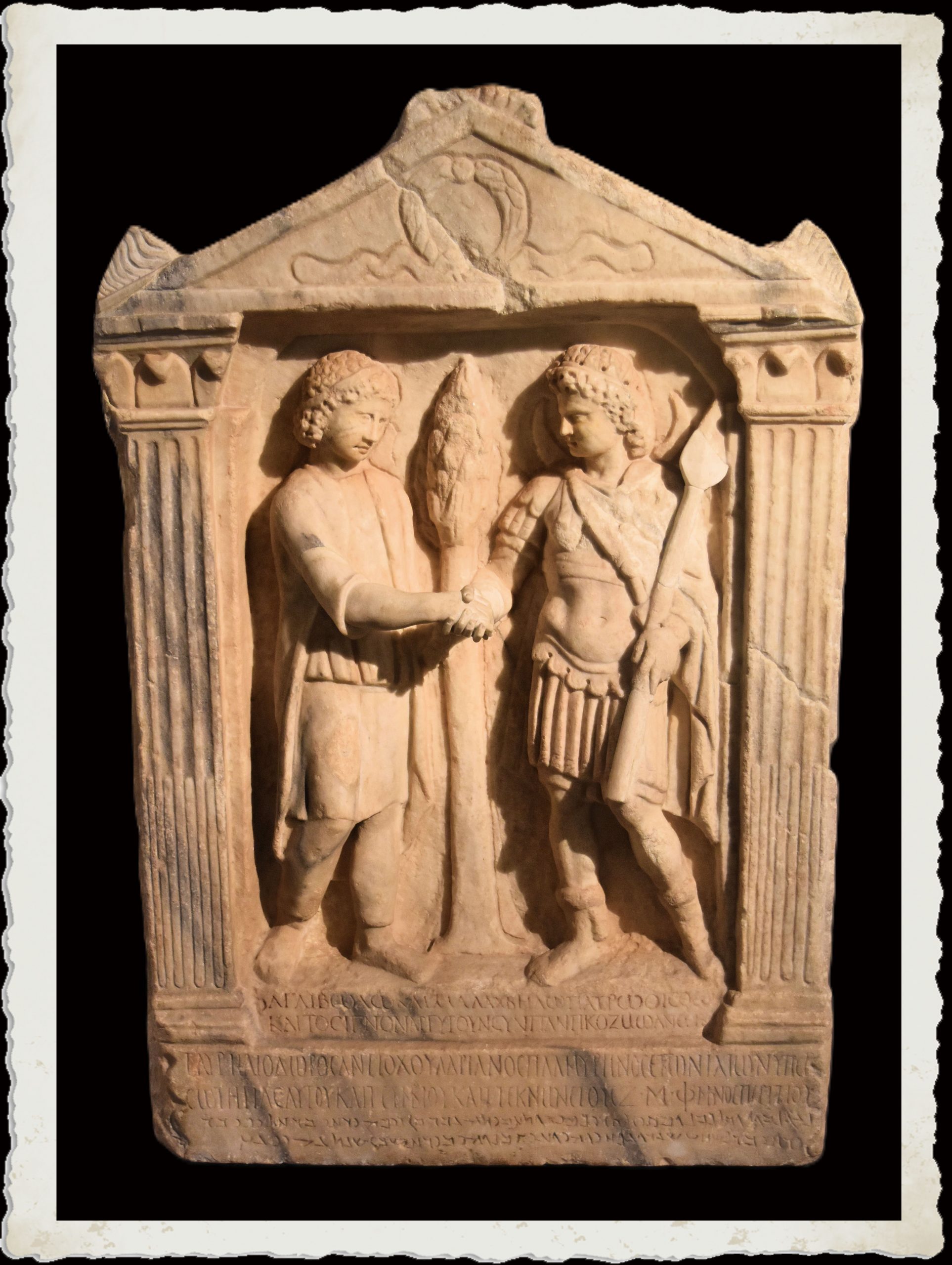 “Agli dei patri Aglibol e Malakbel, Caios Aurelios Heliodoros Adrianos, figlio di Antiochos, originario di Palmira, dedicò a proprie spese (questo ex-voto) e la statua di argento con ogni decorazione, per la sua salvezza, di sua moglie e dei suoi figli, nell’anno 547 (dell’era seleucidica; 235-236 d.C.), nel mese di Peritio (febbraio). Agli (dei) Aglibol e Malakbel, Iarhai figlio di Haliphi, figlio di Iarhai, figlio di Lisams, figlio di Sò adu, a sue spese dedicò per la sua salvezza e dei suoi figli, una statua d’argento e ogni decorazione, nel mese di Sebat (febbraio) dell’anno 547 (dell’era seleucidica; 235-236 d.C.)”. Nella nicchia le due divinità, Aglibol a destra e Malakbel a sinistra, sono raffigurate nell’atto di stringersi la mano (fonte: didascalia museo)
