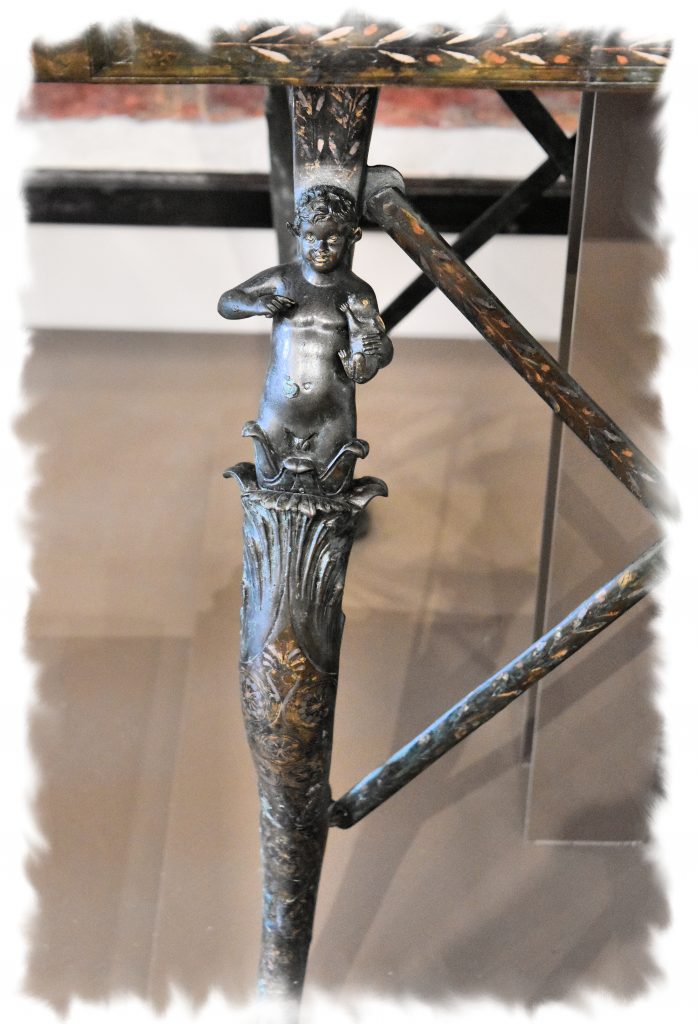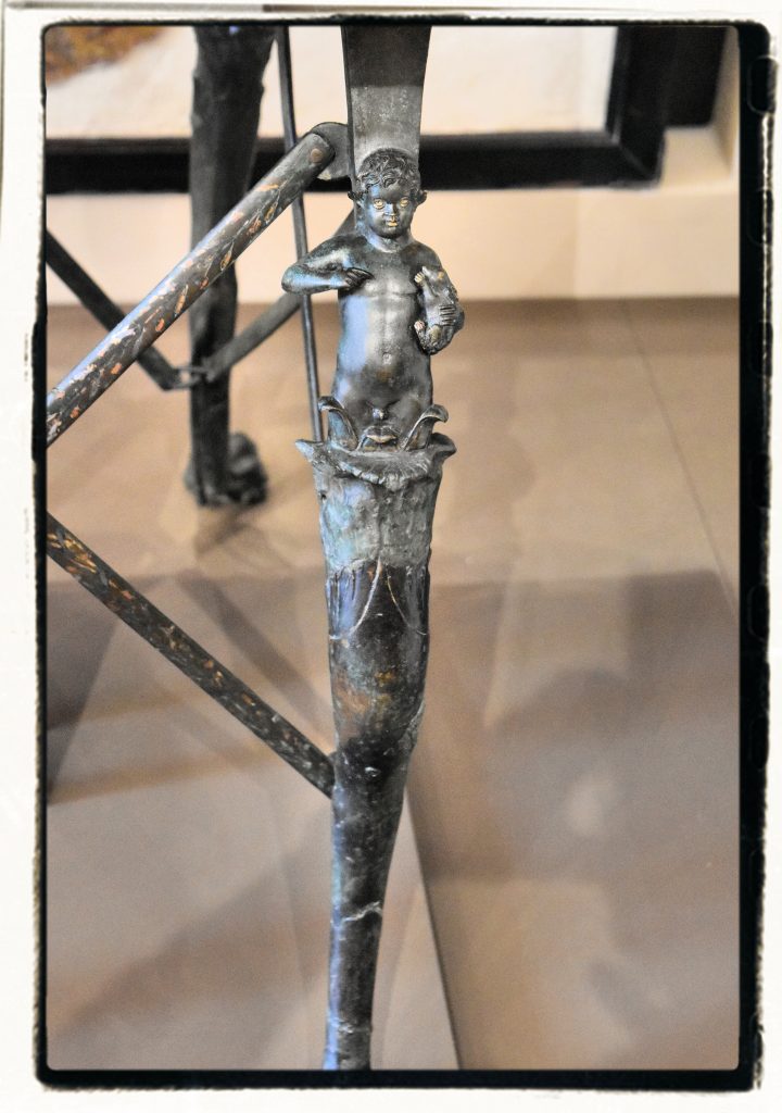 L’elaborata struttura di sostegno del tavolo, pieghevole, ne consentiva il trasporto. Non meno sorprendente la decorazione, con zampe ferine terminanti in calici vegetali, dai quali emergono torsi di giovani satiri che stringono al petto dei leprotti. Ogni elemento è impreziosito da ageminature in metalli diversi, presenti anche sulla fascia in bronzo che cinge il piano marmoreo del tavolo. (fonte: didascalia museo)