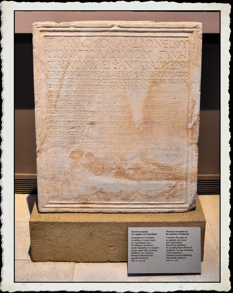 Essa menziona i nomi dei 64 efebi che onorano il loro gimnasiarca, Titus Flavius Apollonius, per aver fornito loro l’olio necessario per un giorno di allenamento nel Ginnasio (fonte: didascalia museo)