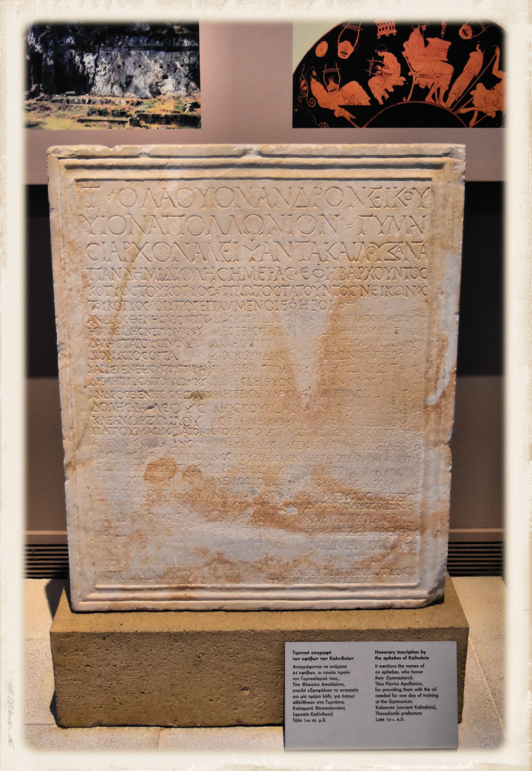 Essa menziona i nomi dei 64 efebi che onorano il loro gimnasiarca, Titus Flavius Apollonius, per aver fornito loro l’olio necessario per un giorno di allenamento nel Ginnasio (fonte: didascalia museo)