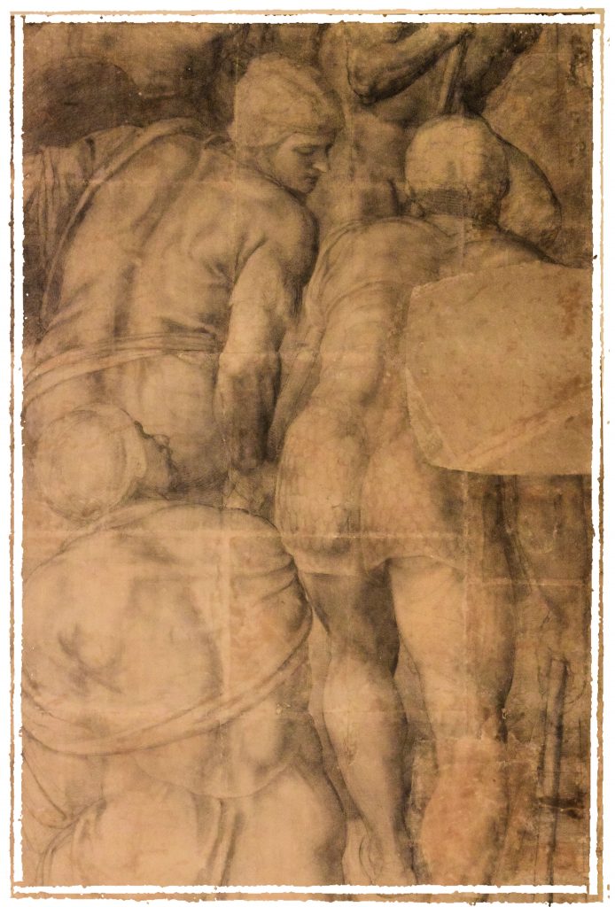 Il cartone, confluito originariamente nella raccolta di Fulvio Orsini, noto mecenate e collezionista che operò per più di quarant’anni per la dinastia Farnese, fu realizzato da Michelangelo per il Martirio di San Pietro, affresco della Cappella Paolina in Vaticano. L’opera, da un punto di vista tecnico, si pone come stadio intermedio tra il bozzetto e il lavoro finale. In particolare, le immagini degli armigeri furono impresse dal Buonarroti nell’angolo in basso a sinistra della parete della cappella mediante la tecnica dello ‘spolvero’, cioè sbattendo polvere di carbone lungo i contorni forati delle loro sagome. (testo a cura di Naòs-Nel cuore dell’arte e del sapere)
