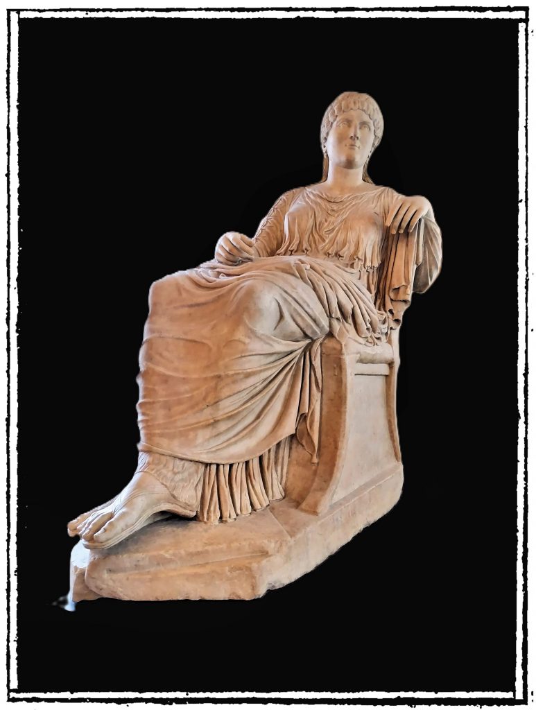 L’opera, probabilmente di proprietà del cardinale Ippolito II d’Este (1509-1572), è forse da identificare con una delle due sculture femminili sedute, rinvenute a metà del Cinquecento a Villa Adriana. Giunta a Firenze sul finire dello stesso secolo, questa statua fu dapprima posizionata nel Giardino di Boboli. Nella figura si riconosce uno dei rari ritratti dell’imperatrice Elena (248-329 circa), madre di Costantino (306-337 d.C.), celebrata dalle fonti per aver rinvenuto a Gerusalemme la reliquia della Vera Croce. La statua è, però, frutto della rilavorazione di un’opera più antica, raffigurante Lucilla o Faustina Minore, rispettivamente sorella e madre dell’imperatore Commodo (180-192 d.C. – fonte: didascalia museo).