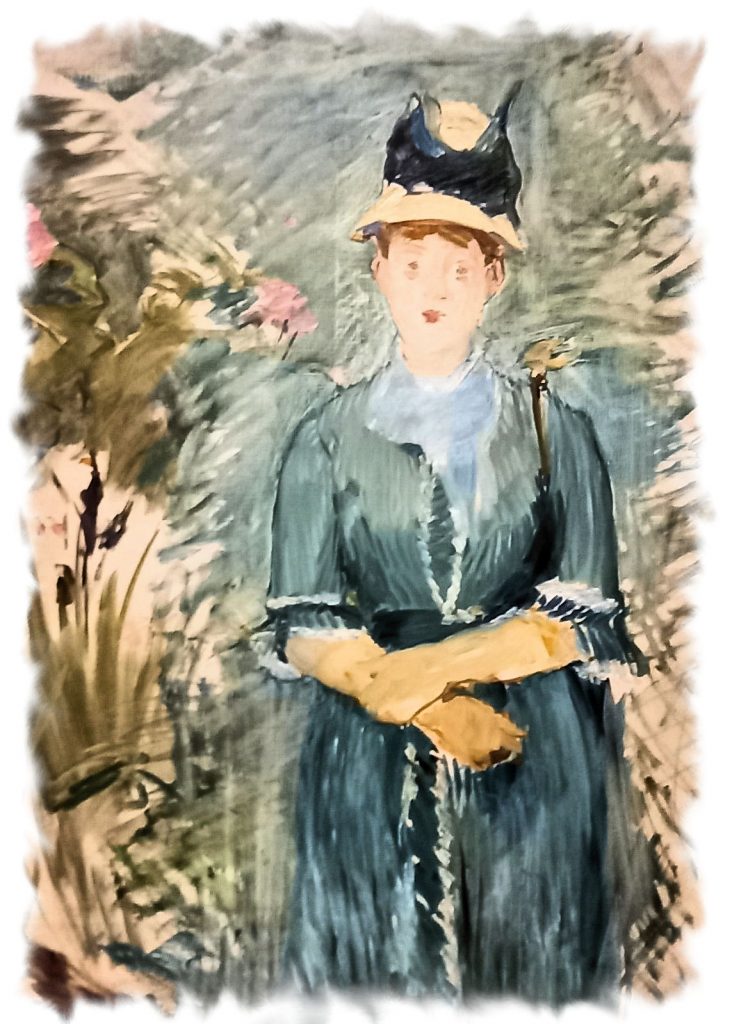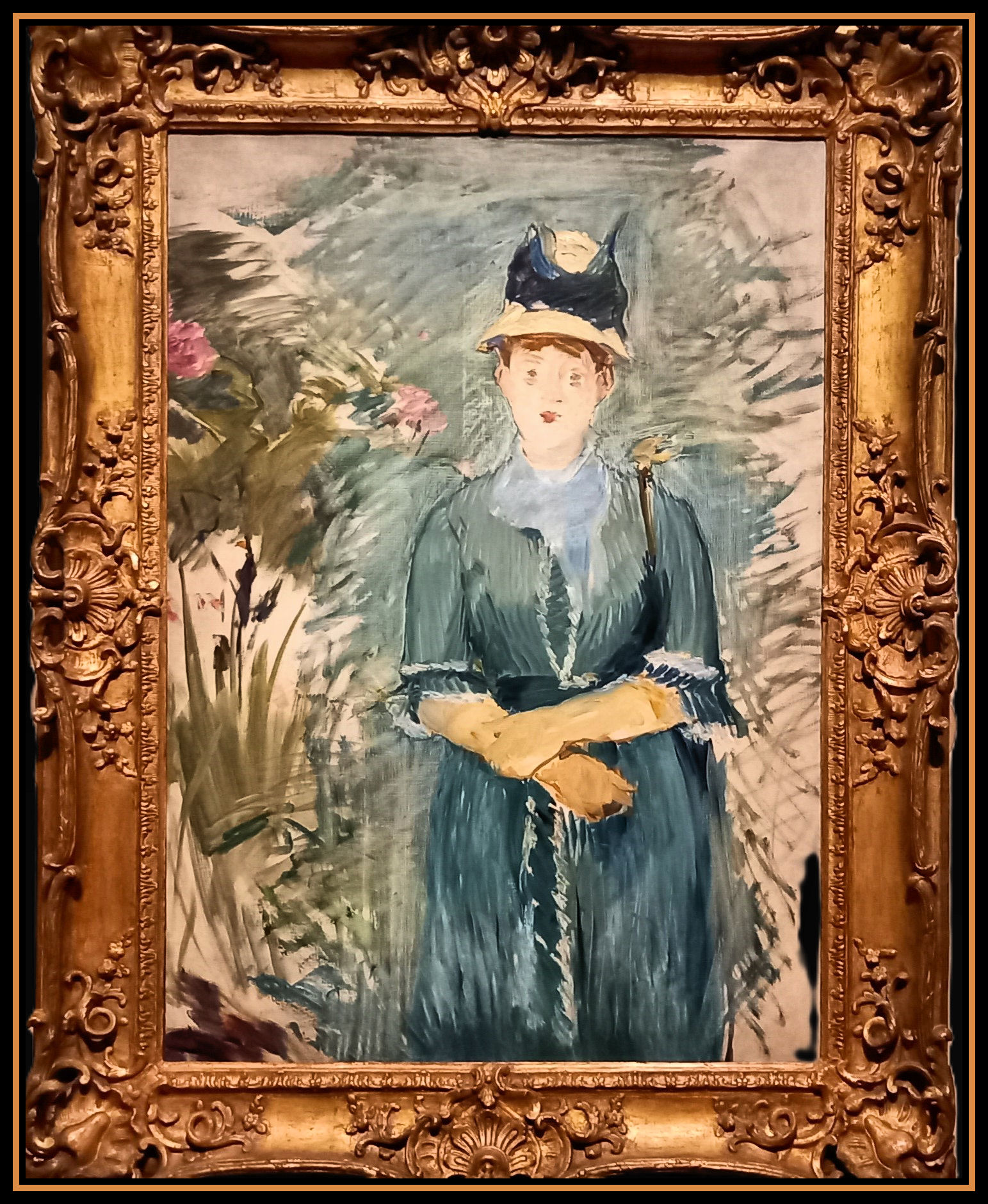 Questa tela mostra la vicinanza, quanto a stile e a scelta dei soggetti, tra Edouard Manet e Berthe Morisot soprattutto nel corso degli anni Settanta. L’opera, che raffigura una donna in posa frontale e circondata da fiori, esemplifica alla perfezione il contatto di Manet con la poetica impressionista. La figura femminile in abito lungo e cappello sembra quasi assorbita dalla vegetazione che la avvolge; i tocchi veloci e leggeri danno alla composizione un senso di non finito. (fonte: didascalia mostra)
