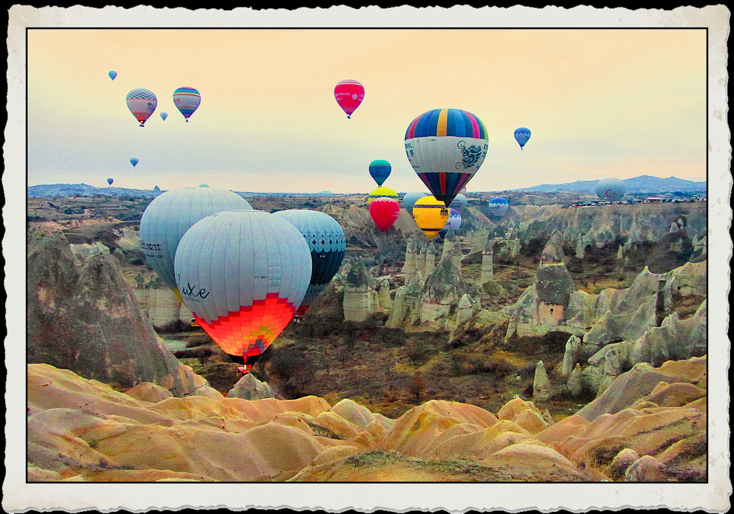 Se tre o quattro ore di viaggio non spaventano, da Konya si può raggiungere la Cappadocia e ammirare uno dei paesaggi più sorprendenti del pianeta. L’area diventò un altopiano circa dieci milioni di anni fa, quando una serie di vulcani riempì di lava vaste depressioni. Tuttavia, si trattava per lo più di un minerale poco resistente all’erosione degli agenti atmosferici e nel corso dei secoli è stato modellato fino a ottenere le caratteristiche formazioni a punta che oggi costellano tutta l’area. Oltretutto, la malleabilità della roccia nei secoli passati ha consentito agli abitanti di scavare grotte per gli animali o per il deposito dei materiali, nonché per abitazioni. Quelle caverne oggi fanno bella mostra di sé, come tanti occhi puntellano intere colline e si lasciano fotografare da turisti incantati. In certi casi, i proprietari le addobbano e le offrono agli stranieri come un giro di giostra in cambio di qualche euro. Ma l’attrazione più potente della Cappadocia non è storica, non è naturalistica. Vola. Le mongolfiere della Cappadocia sorgono insieme all’alba, ogni mattina. Colorate e pigre come i primi raggi del sole, si sollevano lente e mute dai piedi dei camini delle fate fino al cielo che schiarisce e che le illumina.
