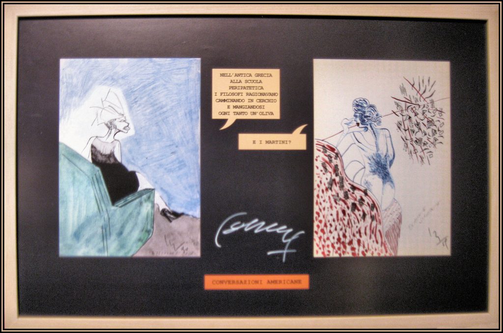 Nell’opera a stampa Conversazioni americane(in mostra vi sono anche i due disegni originali), due donne discorrono amabilmente. La prima discute di filosofia, di scuola paritetica, di “olive”, richiamo, quest’ultimo, che riporta all’antica Grecia e all’ulivo (pianta sacra alla dea Atena) ma allo stesso tempo ad un’altra immagine, opposta e apparentemente illogica: quella dell’oliva che accompagna un celebre cocktail. “E i Martini? Così risponde la seconda donna di Conversazioni americane non appena sente pronunciare la parola “oliva”. Ci troviamo di fronte ad un paradosso che rivela tutto l’umorismo sottile di Paolo Conte. In questo modo i titoli delle sue opere giocano spesso con le parole e con i doppi sensi, offrendo un’immediata interpretazione anche al visitatore meno preparato a coglierne i significati.